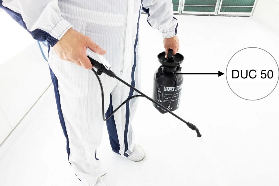 Töltse fel és indítsa el a DUC 50 nyomáspermetezőt háromnegyedig.